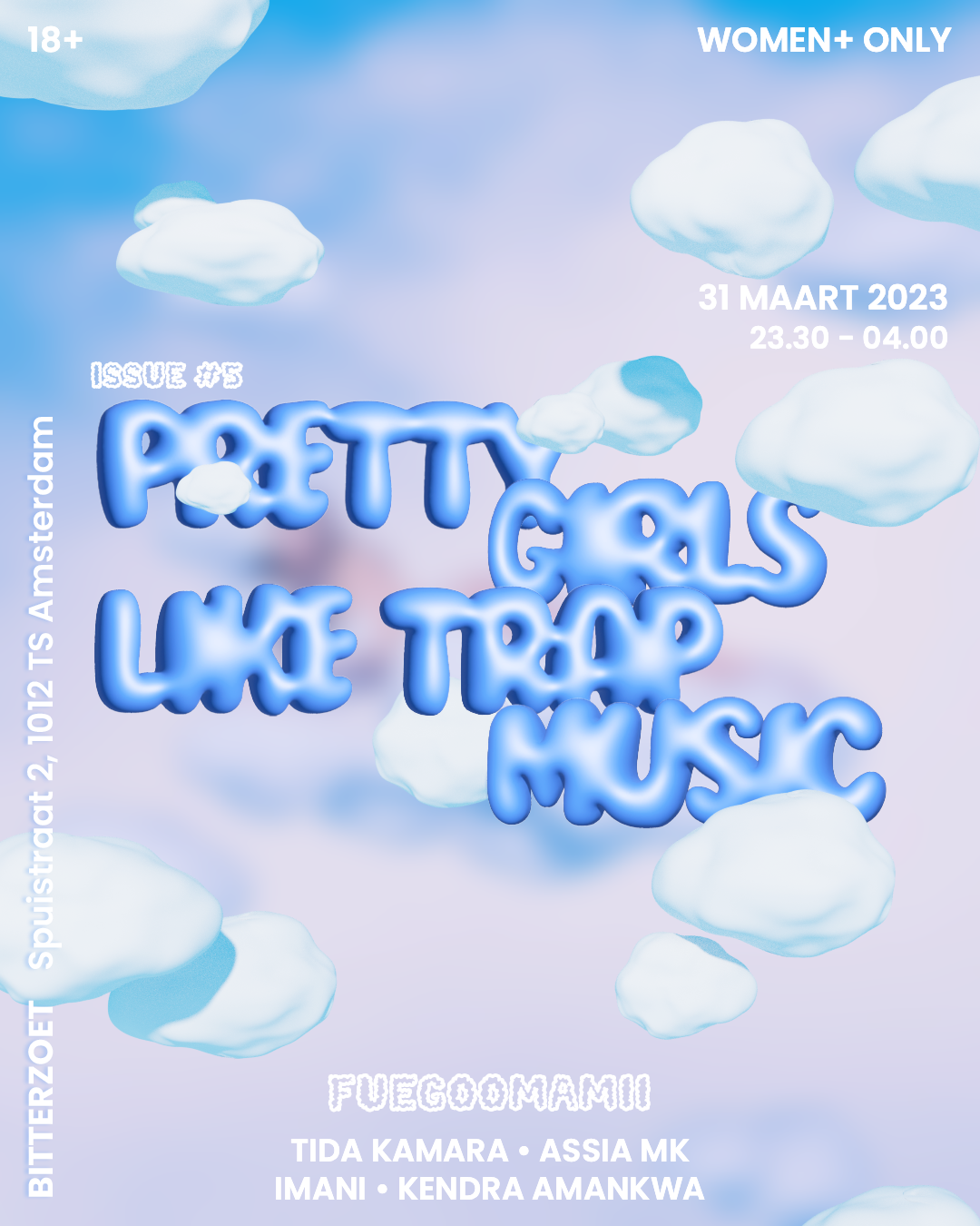 This poster for Pretty Girls Like Trap Music edition 5 features 3D-animated clouds, reflecting the seasonal spring theme with clear skies and the fresh energy of early spring.